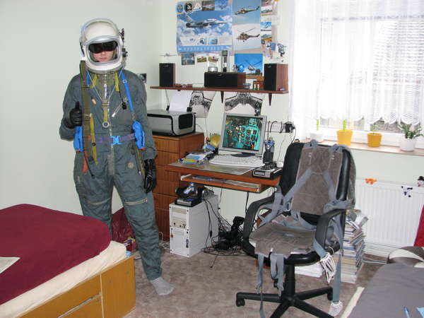 Někdo tady chtěl po mě kdysi fotky, tak tady jich pár je. Ono totiž dneska neni doma mamka, takže jsme s tátou udělali drobnou inventuru zlomku toho co má nasbírané, a kromě bot, ponožek, spodního prádla a speciálního postroje do sedačky jsem na sobě měl kompletní výbavu pro výškové stíhače včetně padáku. V tomhle samozřejmě nelítám FS, mám v tom problém rovně stát, nebo se pohybovat . Ale jen tak pro představu, že praštěný lidi nevymřeli . Takhle vypadá mé pracoviště defaultně, ale jak říkám: V tomhle samozřejmě nelítám, obléct mě do toho nám trvalo přes půl hodiny.